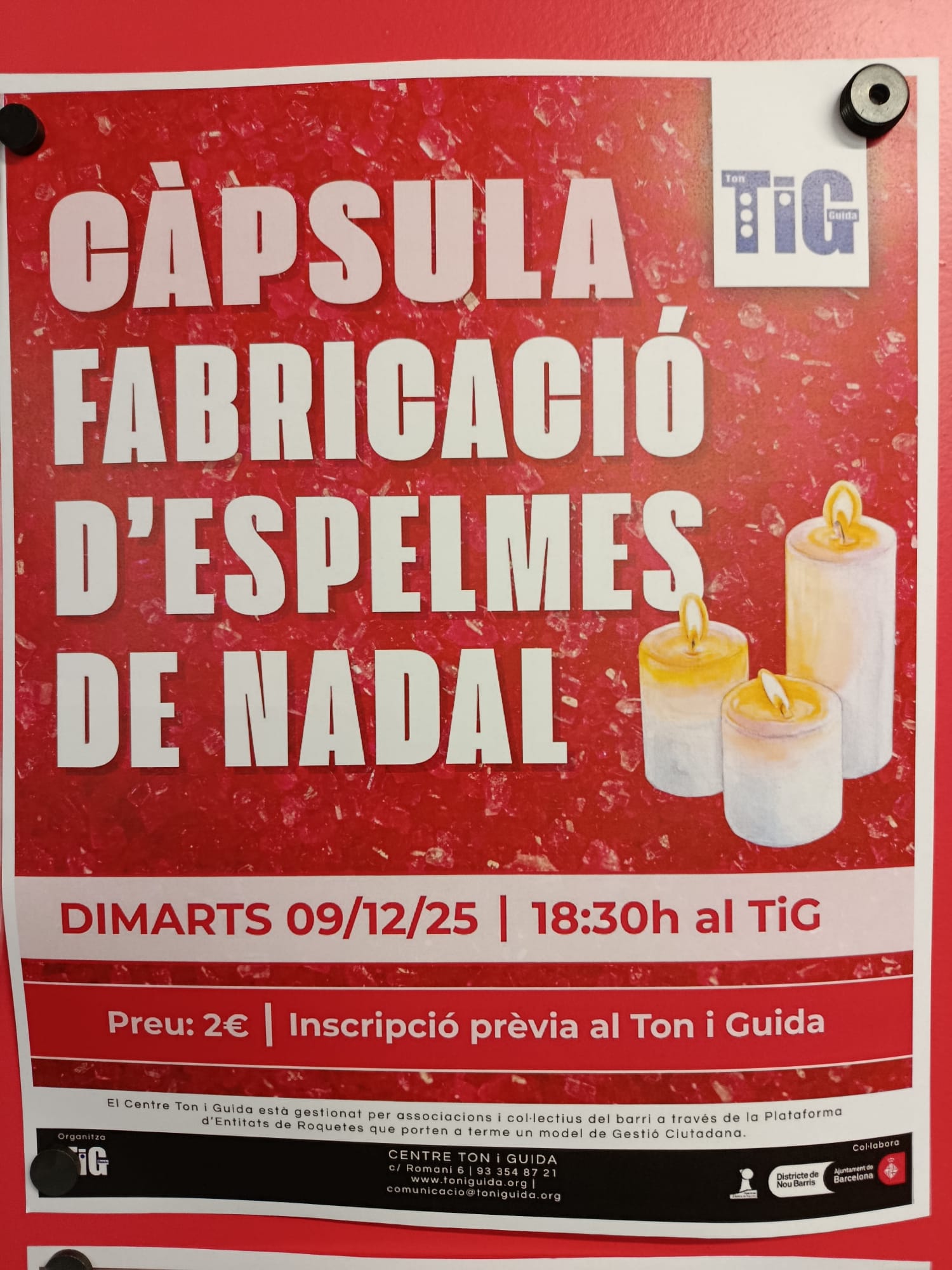 Dimarts, el dia 9 de Desembre a les 18:30h, vam organitzar una càpsula de fabricació d’espelmes de Nadal. El taller va tenir lloc en el Centre Ton i Guida on es van presentar 13 participants. Gràcies a tothom per participar i esperem que hagueu gaudit d’aquesta experiència.