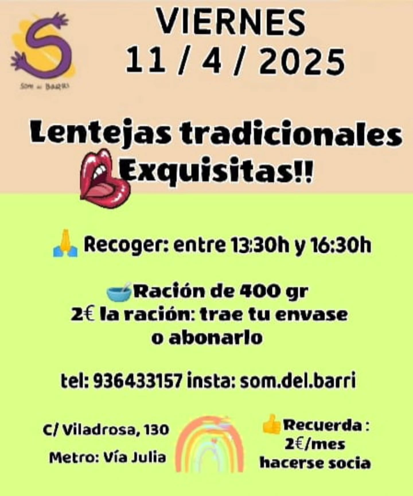 Ven a buscar tu ración, la que mas te guste lista para comer 😋🍽Estamos en C/Viladrosa,130Lunes y Martes a partir 17hMiércoles de 11-13h