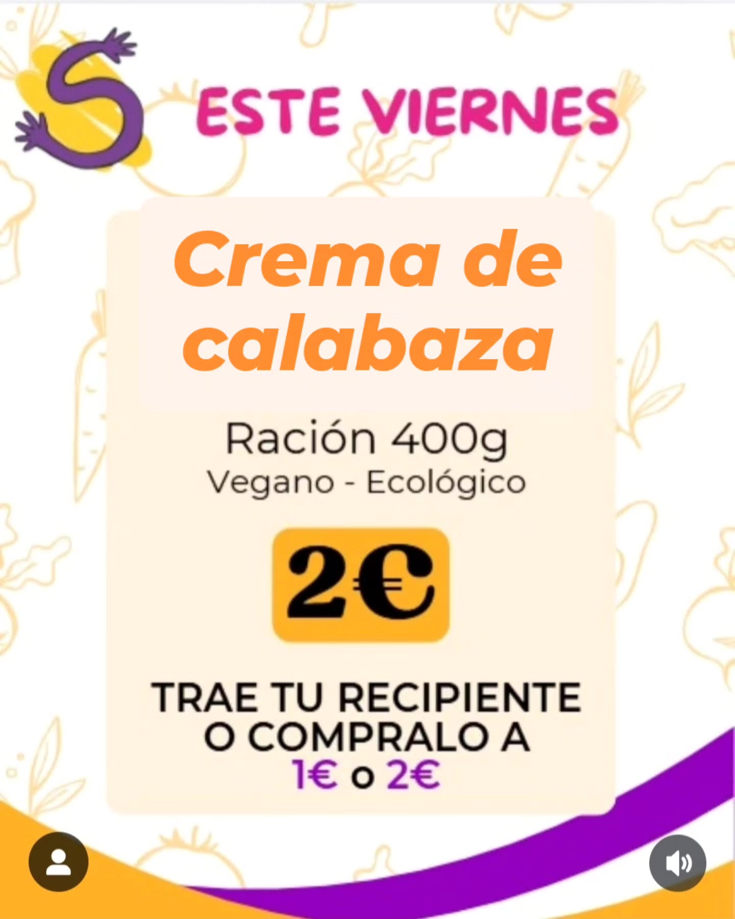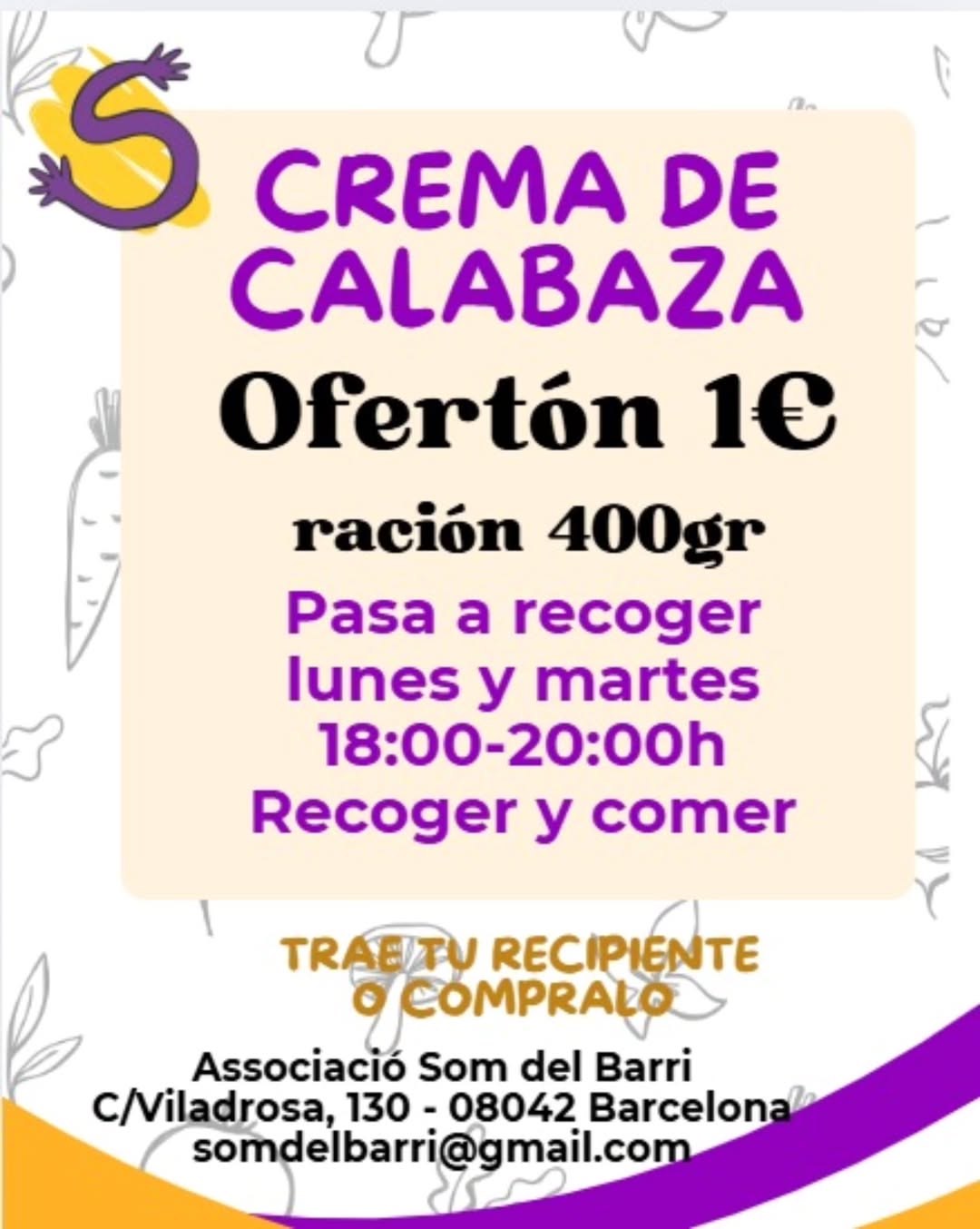Lunes 13, martes 14 Recoge una cena rica y sabrosa, por 1€ tu ración 400gr de crema de Calabaza 😋